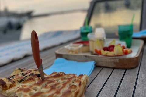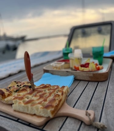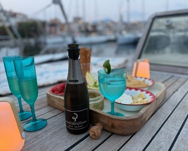 Sur demande lors de la réservation une collation gourmande peut vous être servie à bord avant de rentrer à Cogolin, dans la lumière dorée de la fin de journée, en compagnie d'autres yachts de luxe.